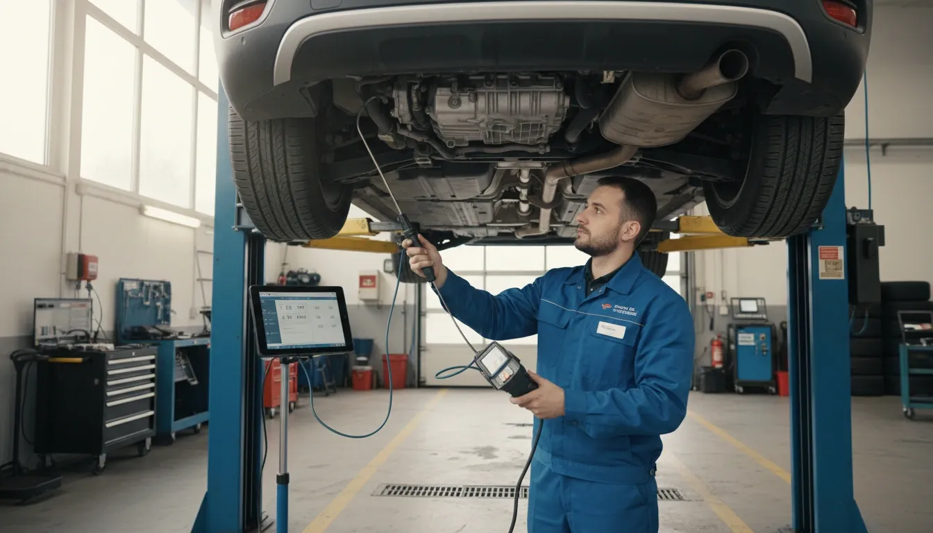 - Inspection visuelle de l’échappement : Toute la ligne est inspectée. Une fuite, un silencieux percé ou une fixation défaillante peuvent suffire pour une contre-visite.