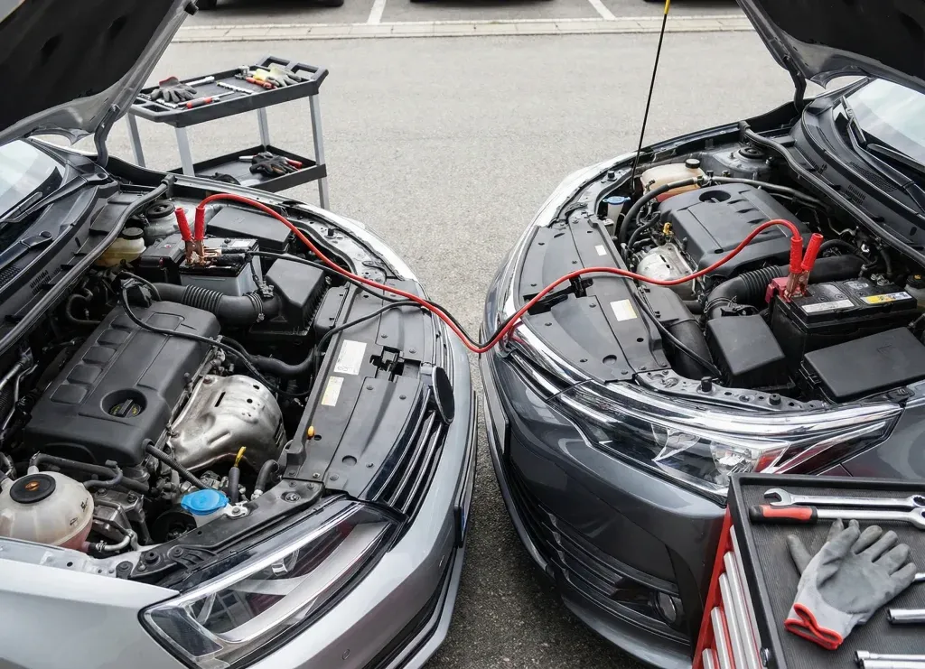 Garez les deux véhicules nez à nez sans qu’ils se touchent pour éviter tout arc électrique. Vérifiez impérativement que les deux batteries affichent une tension identique de 12 volts. Coupez le contact des deux voitures avant toute manipulation.