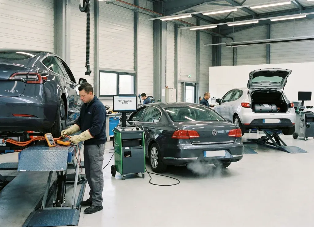 Même sans test de pollution sur un véhicule 100% électrique, les vérifications de sécurité spécifiques compensent ce gain et rallongent inévitablement la durée de l’intervention.