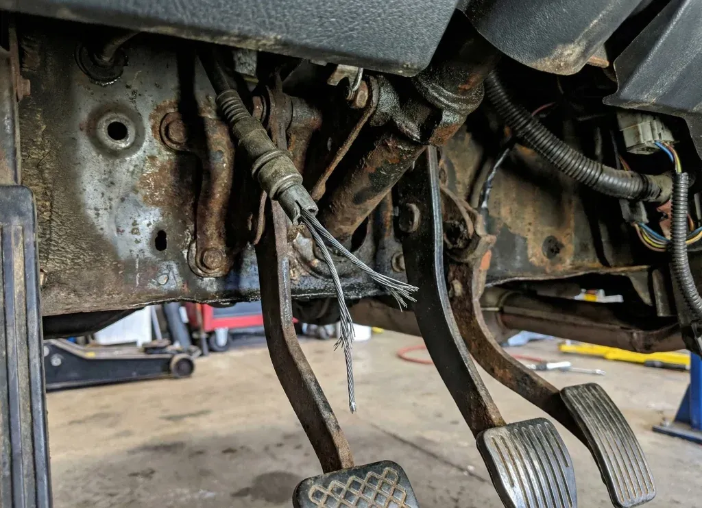 Avec le temps, ce câble peut s’effilocher progressivement. Il finit par casser net, laissant la pédale au plancher. Il peut aussi gripper dans sa gaine. La rouille ou la saleté bloquent alors le mouvement.
