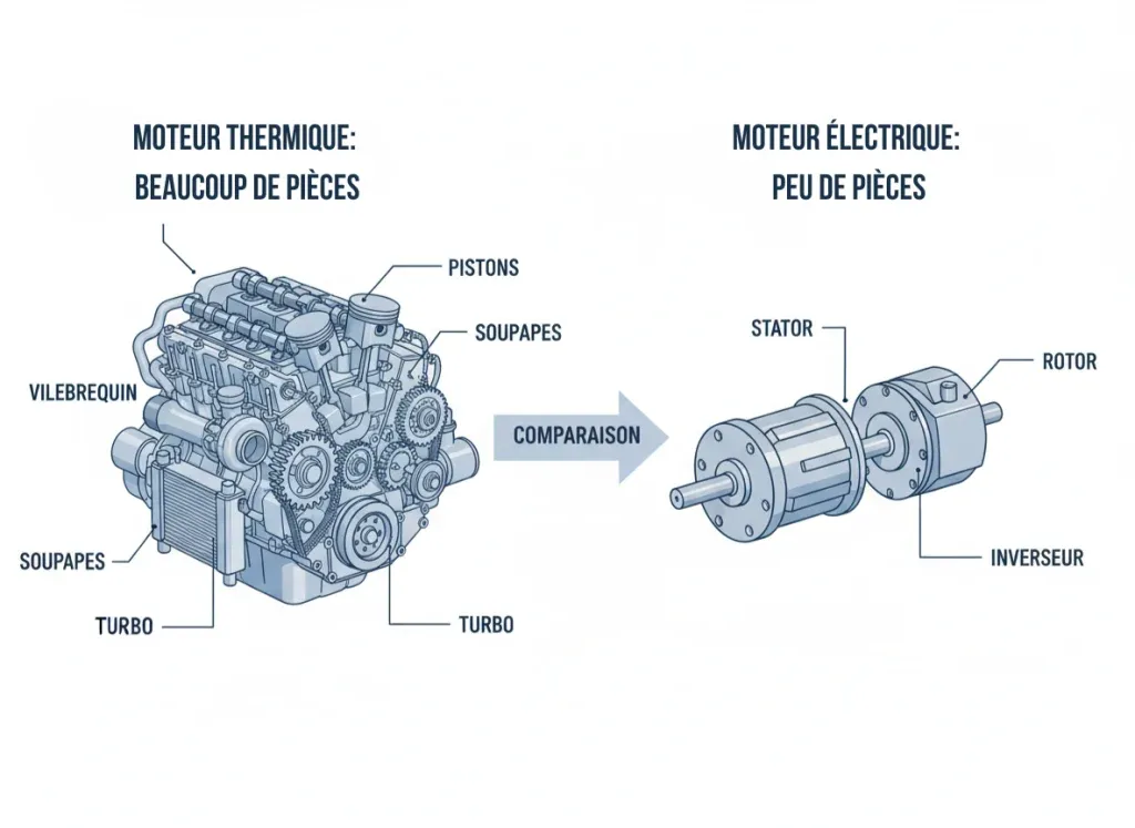 Moteur électrique : 10 pièces contre des milliers. Pas de vidange ni courroie. Freinage régénératif réduit l’usure des plaquettes de 50 %.