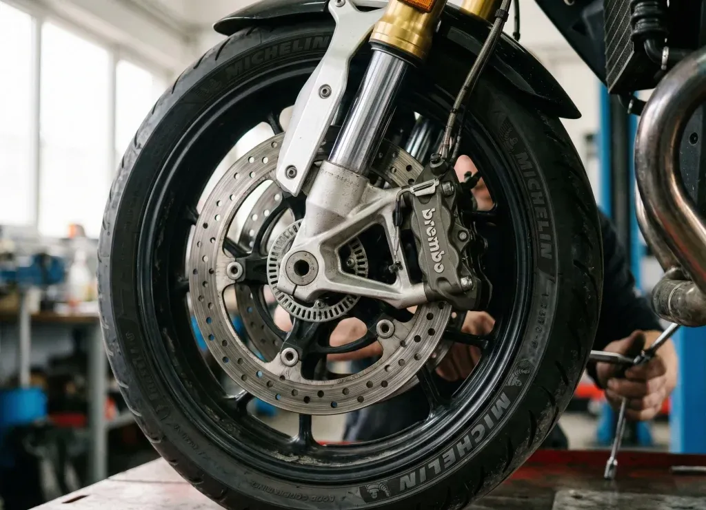 Les suspensions garantissent l’adhérence. L’examen cible la fourche avant et les amortisseurs arrière. C’est un contrôle technique moto point de contrôle déterminant pour la tenue de route.