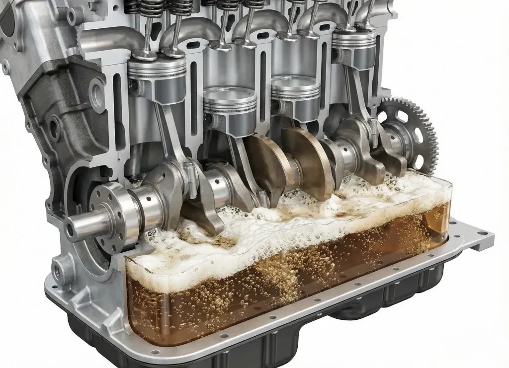 Le vilebrequin frappe violemment la surface de l’huile en excès. Ce mouvement rapide piège l’air et crée des bulles. Le liquide se transforme alors en une sorte de mousse.