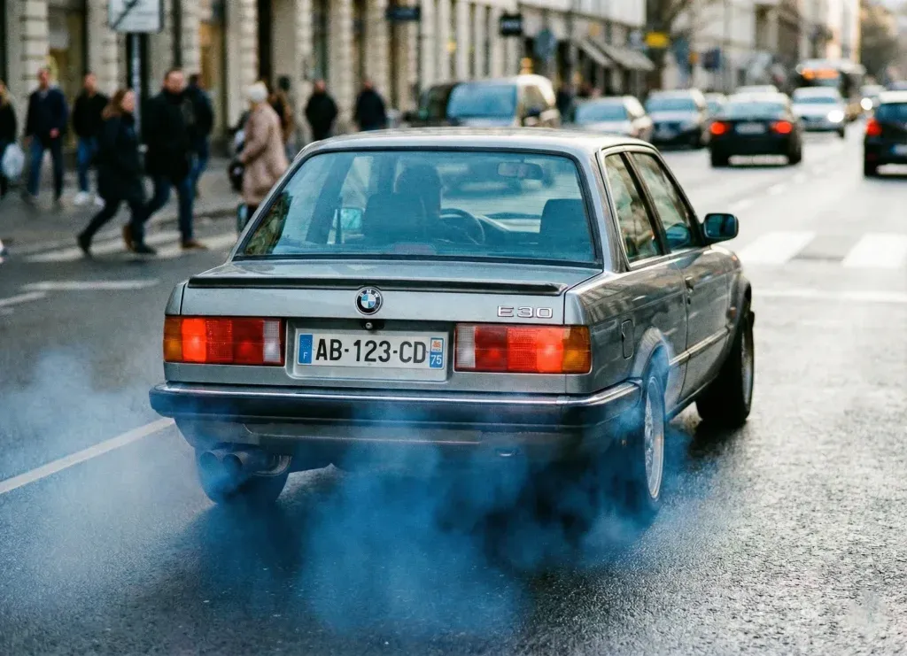 - Une fumée bleutée qui sort de l’échappement, surtout à l’accélération.