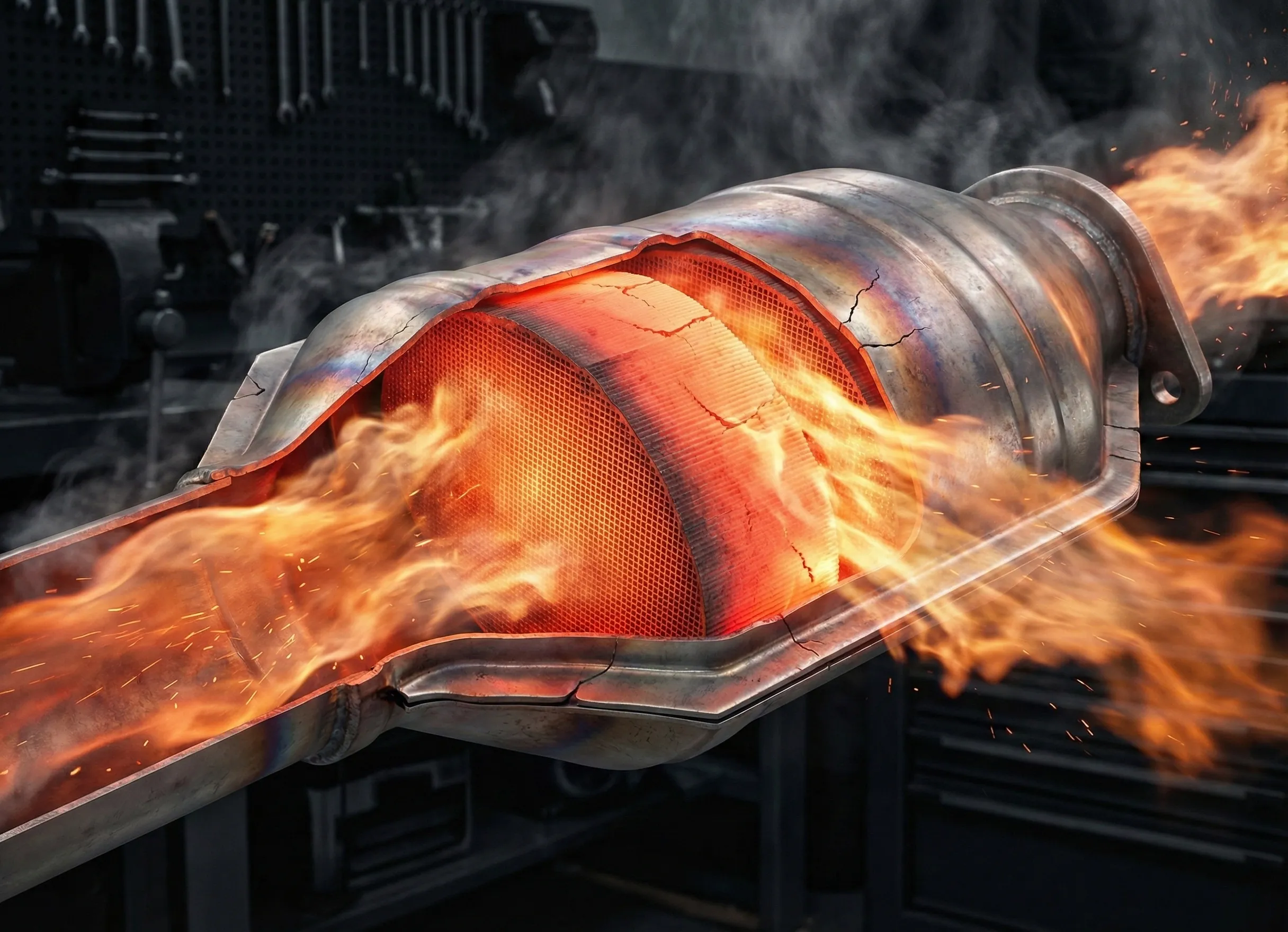 L’essence imbrûlée finit sa course dans le catalyseur brûlant. Cela provoque une fusion interne irrémédiable du nid d’abeille. Cette pièce coûte une fortune à remplacer. Le système subit alors des températures extrêmes destructrices.